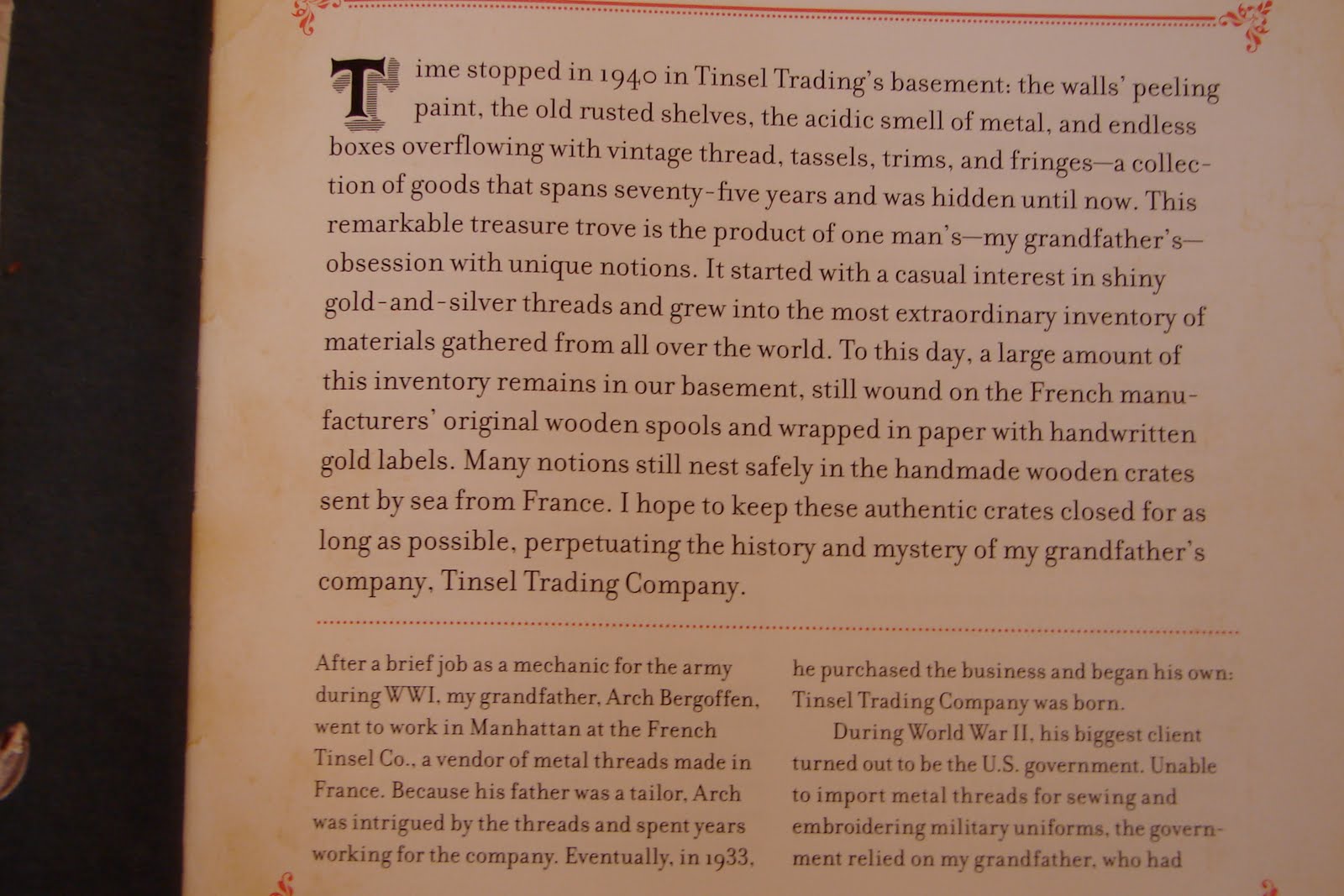 Boy, I'm a bit embarrassed! That was not just any employee I talked to about this fabulous book, but I believe it was the owner of Tinsel Trading herself, Marcia Ceppos. I'm also honored and flattered that Marcia left a nice comment on this post. I'm surprised she happened to find my teeny tiny blog in all of blogland. Had to be through a Google search of the book, I'm sure!