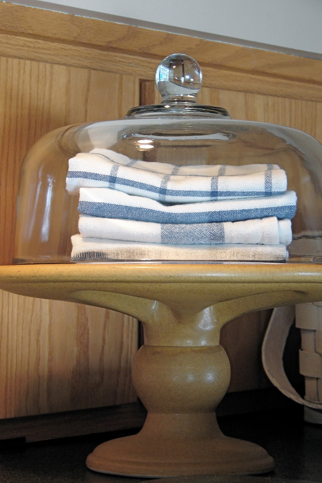 Atop my fridge, I put yet more of the Ikea dish towels on a cake plate.