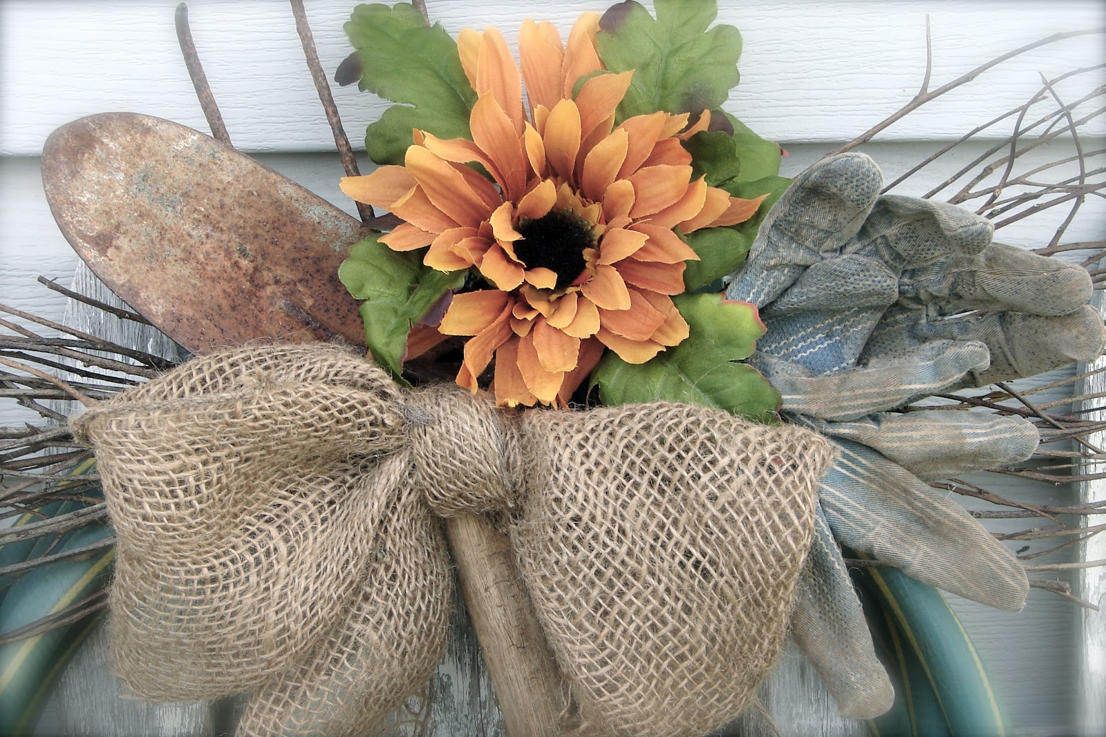 I wanted to use old, weathered items to adorn my garden hose wreath. So I gathered up a couple old, rusty garden tools out of my collection of old, rusty garden tools, and a pair of crusty dirt-stained canvas garden gloves I wasn't using anymore. I wired everything to a small, twig swag thingy and then wired the whole shabang to the coiled garden hose.